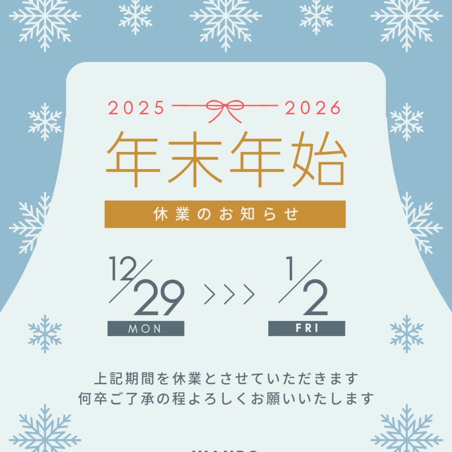 12/29〜1/2まで、WANPOは年末年始休業日とさせていただきます。
